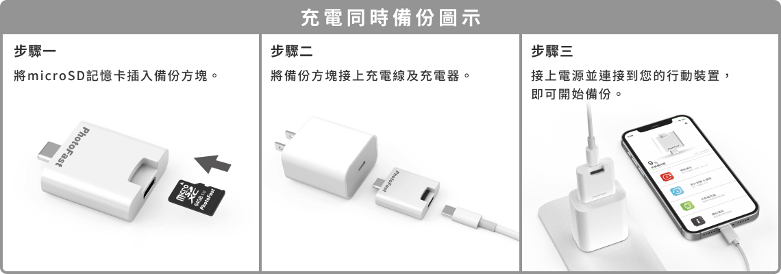 請參閱上方的教學影片,下載及設定完成《 PhotoFast ONE 》APP,並將 microSD 記憶卡插入備份方塊中,
