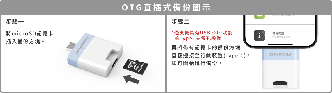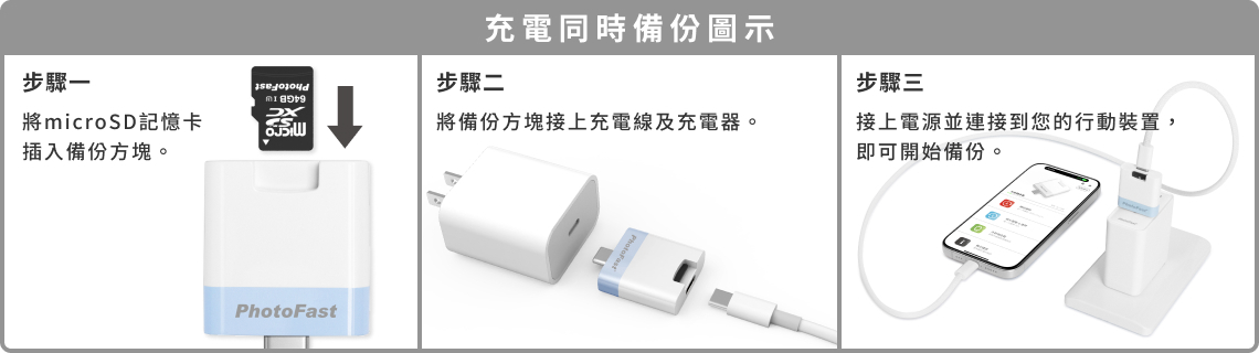 請參閱上方的教學影片,下載及設定完成《 PhotoFast ONE 》App,並將 microSD 記憶卡插入備份方塊中,備份方塊連接 5V(含以上)的 USB 充電器或豆腐頭,再插上充電線,就可以讓手機充電同時自動完成備份囉!