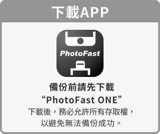 >步驟3. 重新下載安裝《 PhotoFast ONE 》App,安裝過程中所有詢問權限請都選『允許、確認』。