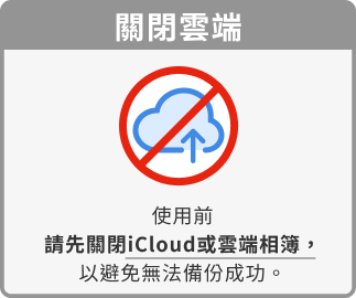 iPhone請先將iCloud關閉,再開始使用備份方塊 !