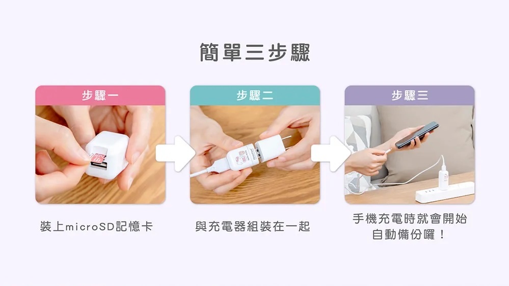 A:下載及設定完成《 PhotoFast ONE 》APP,並將 MicroSD 記憶卡插入備份方塊中,將備份方塊連接5V USB充電器或豆腐頭,再插上充電線,就可以讓手機充電同時自動完成備份囉!