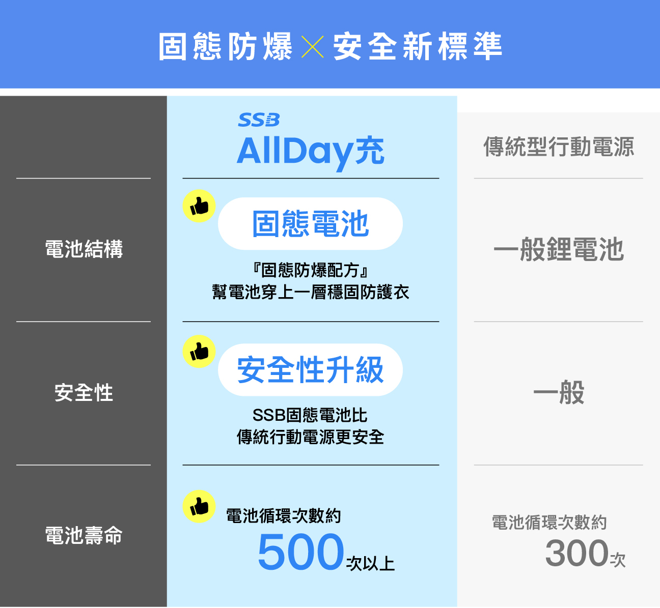 SSB AllDay充採用「防爆固態電池」,安全防爆固態配方就像把會流動的水換成穩定的果凍,猶如幫電池穿上一層穩固防護衣,有效抑止「鋰枝晶」這類導致短路的尖刺狀結晶生成,比傳統型行動電源更安全。