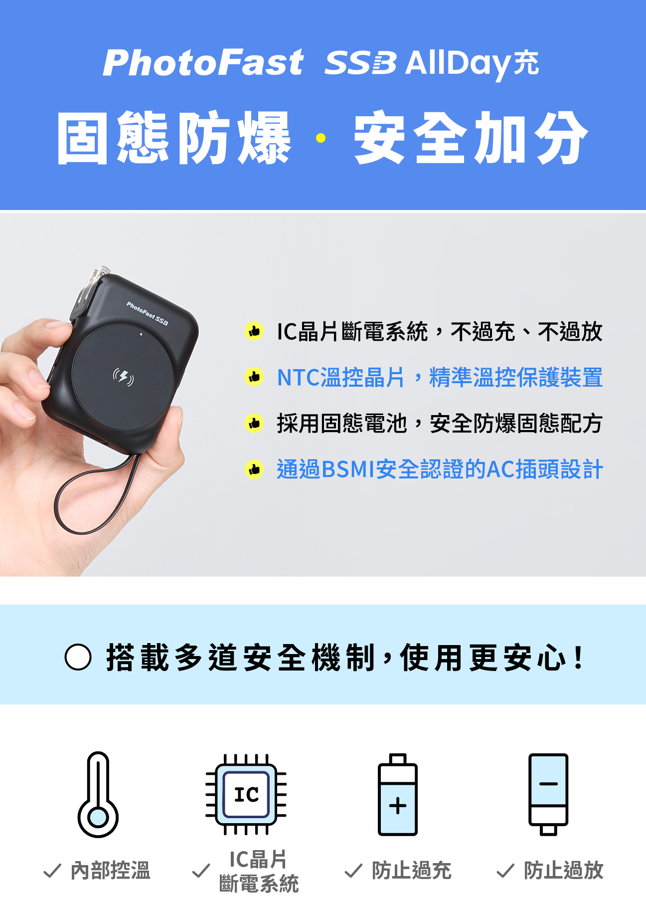 有別於老舊款行動電源大多為簡易保護電路機制,SSB AllDay充採用的是高規格保護電芯PCM以及IC晶片斷電系統,精確監控電壓、電流,以確保行動電源在充電和放電時的安全。