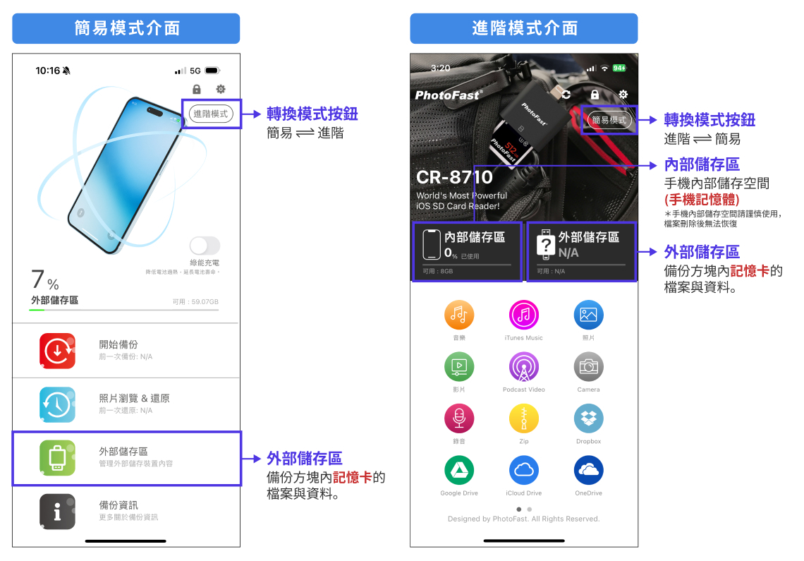 外部儲存區:指記憶充裡『記憶卡內部』的空間。可在進階模式或簡易模式開啟瀏覽,請見下圖說明。