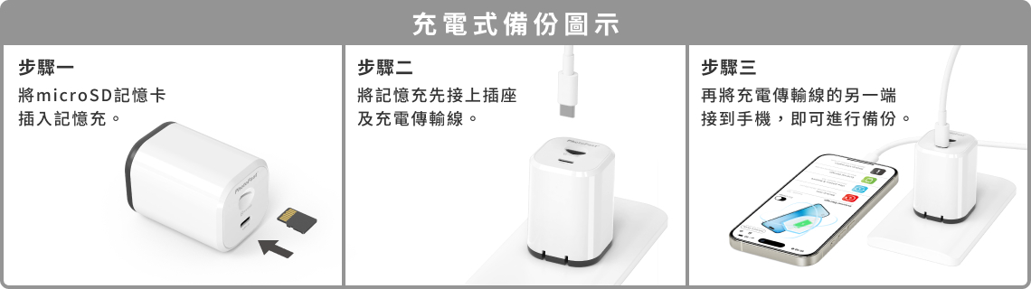 .步驟3:將記憶充接上插座、充電傳輸線連接手機,就可讓手機充電同時自動備份。