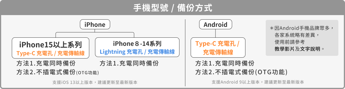 *建議對照手機支援版本(iOS/Android),備份前請先將手機更新到最新版本。