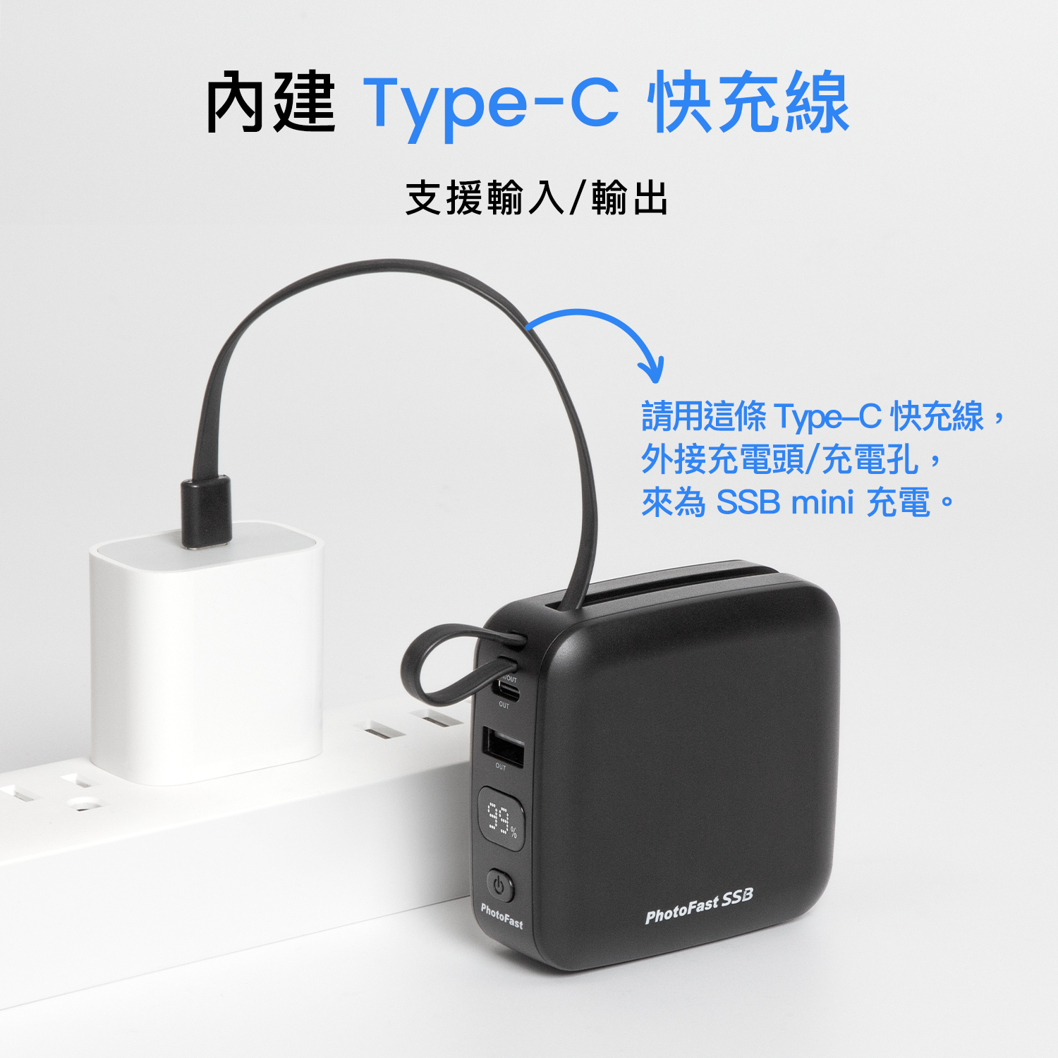 請使用內建的 Type-C 快充線(外接Type-C快充充電頭)為 SSB mini充 充電。