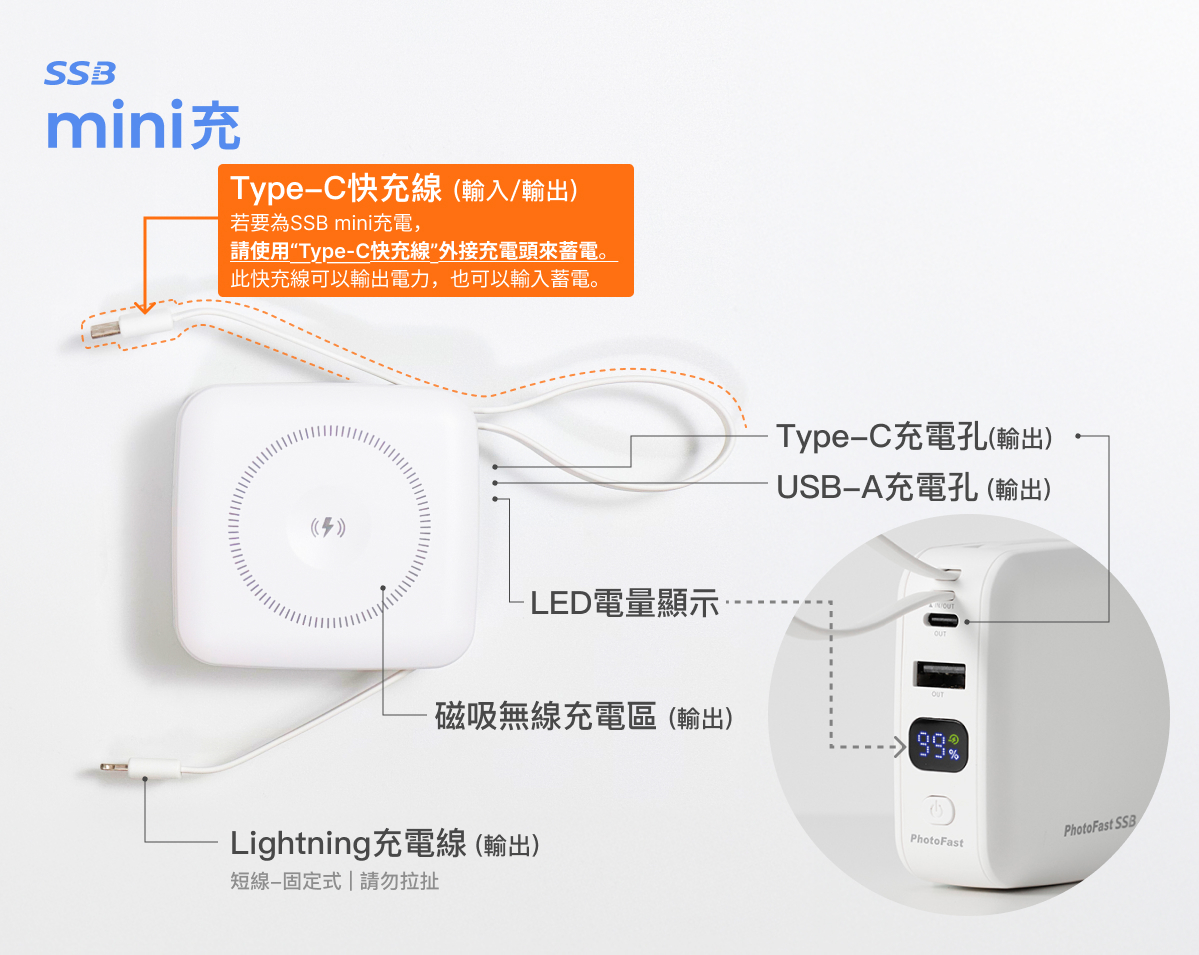 SSB mini充內建Type-C快充線為支援輸入(為行動電源蓄電)/輸出(為設備充電),這樣的設計是有便於行動電源蓄電,您不需要額外準備充電線,只需有Type-C充電頭就可以為行動電源蓄電。