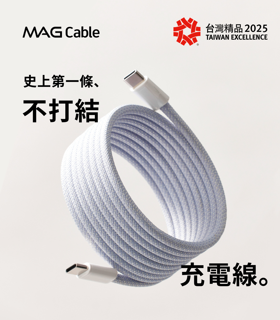 Mag Cable 透過台灣專利技術研發,成功打造出整條都具有磁吸力的線材,不需要魔鬼氈、捲線器、或是額外的磁鐵夾具,就能夠完美的自動捲成小圈圈,緊緊吸附固定、不再捲完就散開、混亂又打結。