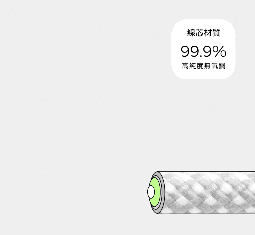 Mag Cable 採用 99.9% 高純度無氧銅線芯,搭配堅固耐用的粗線徑,讓充電的傳輸更加穩定,效率大幅提升。不只如此,Mag Cable 裡外三層都具有「撓性」及「韌性」,這代表線材不容易斷裂或是永久變形,不管怎麼捲,最後都能輕鬆拉直,恢復成原狀!