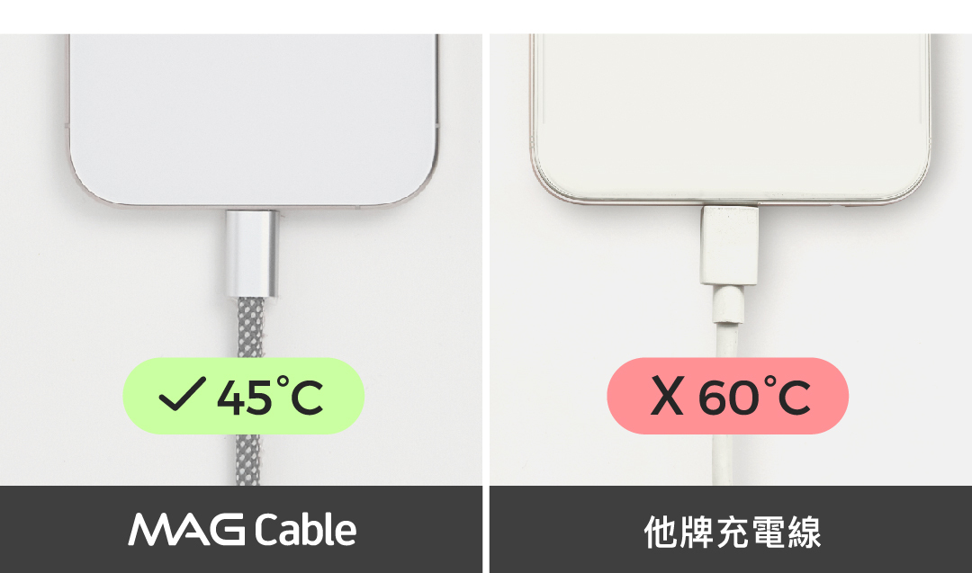 Mag Cable 採用具有控溫功能的 E-marker 晶片,市面一般的線材很少配有此晶片,擁有控溫的功能的更是少之又少!經過測試,使用相同的 MacBook Pro 原廠充電器來充筆電,Mag Cable 的線材溫度是溫和地 45°C,而他牌則可以到微燙的 60°C!