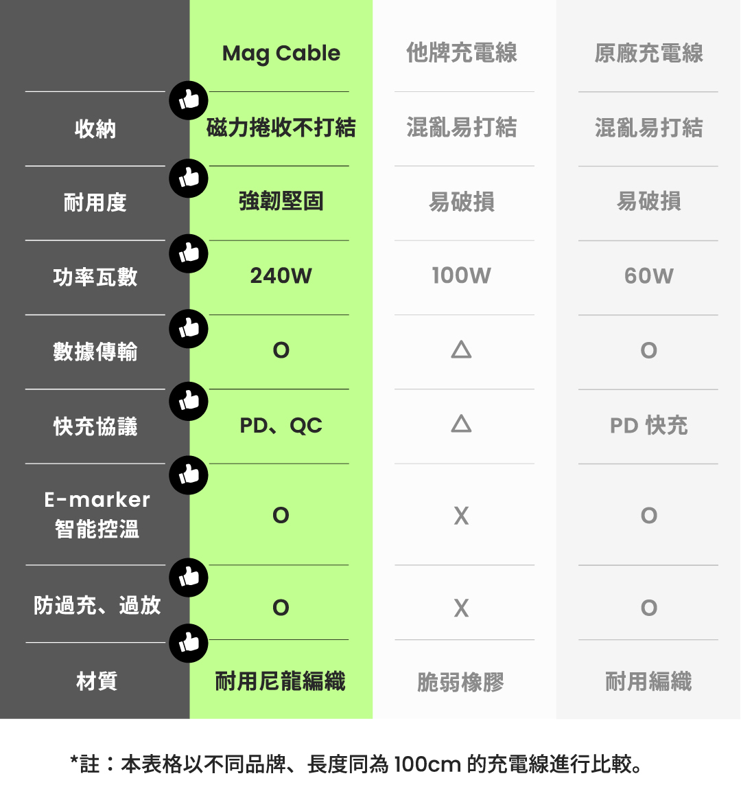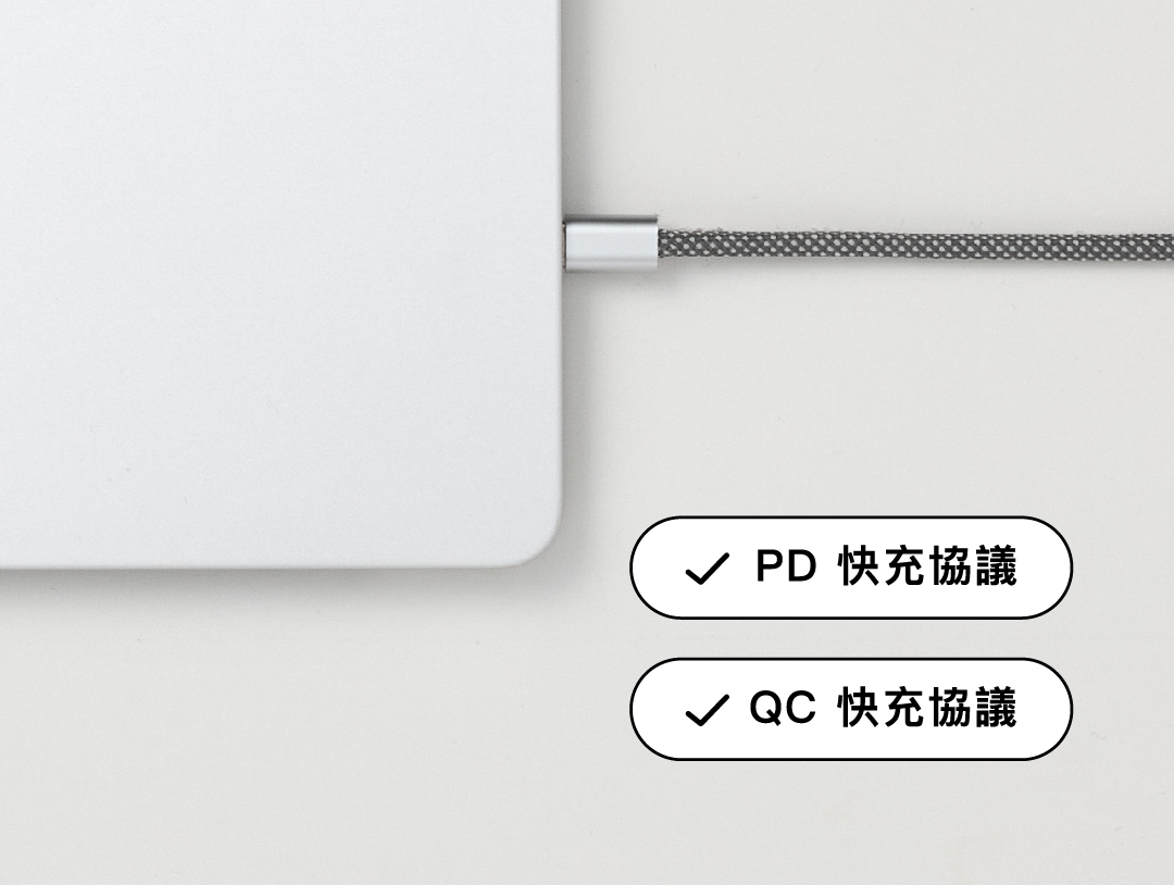 Mag Cable 同時具備最新技術的快充協議,包含 PD 快充協議(Power Delivery)以及 QC 快充協議(Quick Charge),這兩者是全球通用的兩大快充技術,是我們提供給消費者最大的安心保證,市面上許多他牌即使標示了快充功能,但它的快充協議很可能根本不符合國際標準。